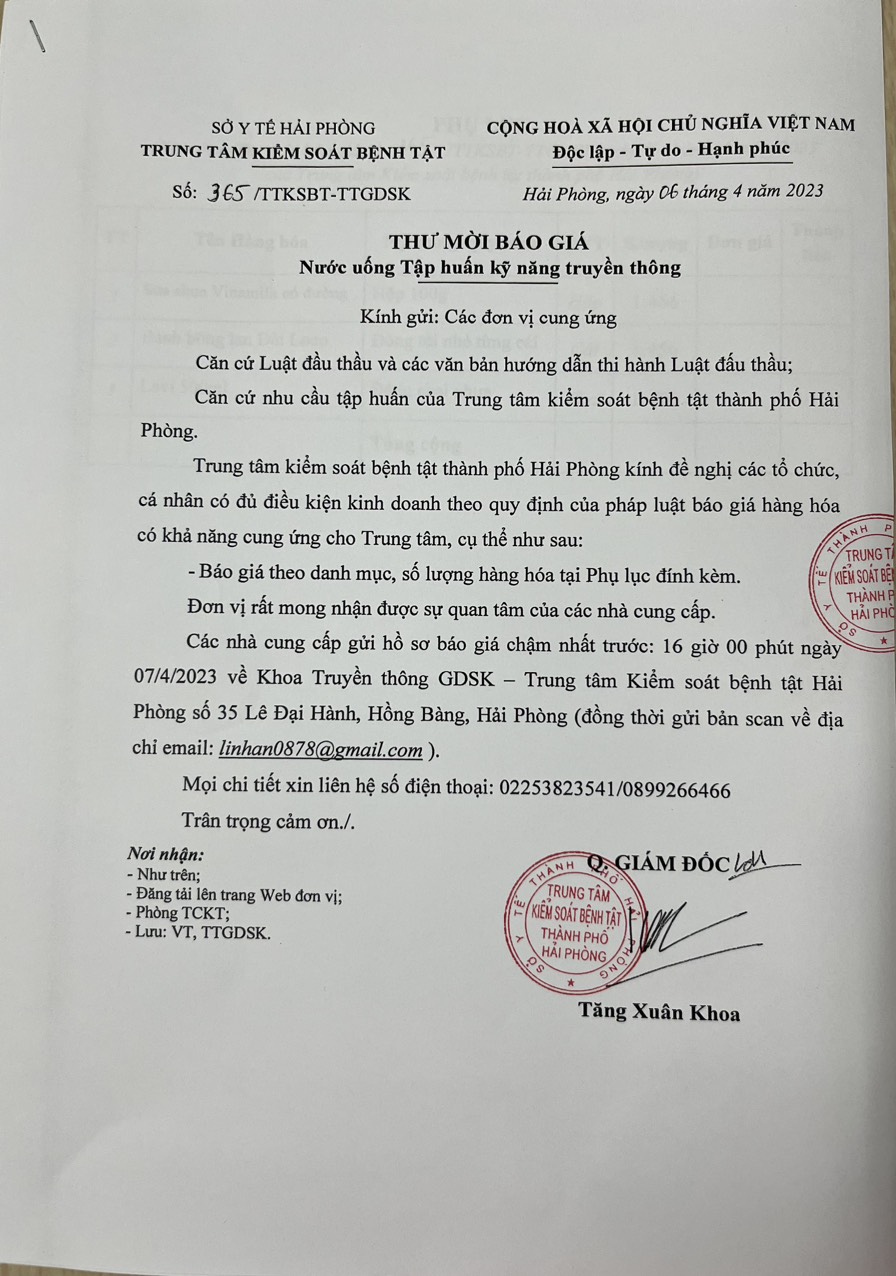 Thư mời báo giá Nước uống Tập huấn kỹ năng truyền thông