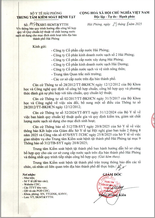 Trang chủHoạt động chuyên mônSức khỏe môi trường - Y tế trường họcCV số 1437/KSBT-SKMT&YTTH v/v Thông báo quy trình hướng dẫn công bố... CV số 1437/KSBT-SKMT&YTTH v/v Thông báo quy trình hướng dẫn công bố hợp quy về Quy chuẩn kỹ thuật về chất lượng nước sạch sử dụng cho mục đích sinh hoạt trên địa bàn thành phố Hải Phòng 29 Tháng 8, 2025 Chia sẻ Facebook Email Print CV số 1437KSBT-SKMT&YTTH vv Thông báo quy trình hướng dẫn công bố hợp quy về Quy chuẩn kỹ thuật về chất lượng nước sạch sử dụng cho mục đích sinh hoạt trên địa bàn thành phố Hải Phòng XEM THÊM Thu hồi lô cốm pha hỗn dịch uống Pyfaclor Kid do vi phạm mức độ 2 8 Tháng 10, 2025 1869 Thư mời báo giá khoa Sức khoẻ sinh sản 8 Tháng 10, 2025 1849 Thư mời báo giá 8 Tháng 10, 2025 TIN PHỔ BIẾN Thu hồi lô cốm pha hỗn dịch uống Pyfaclor Kid do vi phạm mức độ 2 8 Tháng 10, 2025 1869 Thư mời báo giá khoa Sức khoẻ sinh sản 8 Tháng 10, 2025 1849 Thư mời báo giá 8 Tháng 10, 2025 1848 Thư mời báo giá Hoá chất, vật tư xét nghiệm nước, thực phẩm, không khí 8 Tháng 10, 2025 Xem thêm