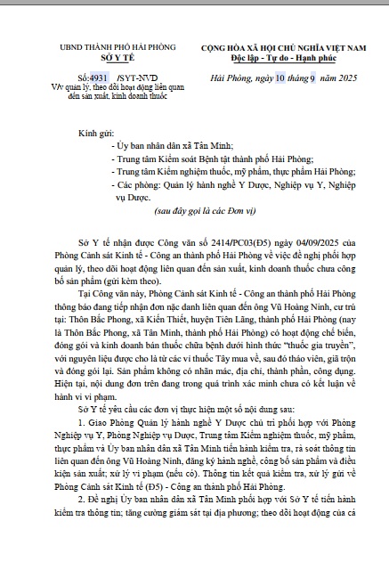 Trang chủTin nổi bậtCV 4931/SYT/NVD v/v quản lý, theo dõi hoạt động liên quan đến... CV 4931/SYT/NVD v/v quản lý, theo dõi hoạt động liên quan đến sản xuất, kinh doanh thuốc 11 Tháng 9, 2025 Chia sẻ Facebook Email Print CV phoi hop quan ly, theo doi hoat dong lien quan den san xuat, kinh doanh thuoc..signed XEM THÊM Thu hồi lô cốm pha hỗn dịch uống Pyfaclor Kid do vi phạm mức độ 2 8 Tháng 10, 2025 1869 Thư mời báo giá khoa Sức khoẻ sinh sản 8 Tháng 10, 2025 1849 Thư mời báo giá 8 Tháng 10, 2025 TIN PHỔ BIẾN Thu hồi lô cốm pha hỗn dịch uống Pyfaclor Kid do vi phạm mức độ 2 8 Tháng 10, 2025 1869 Thư mời báo giá khoa Sức khoẻ sinh sản 8 Tháng 10, 2025 1849 Thư mời báo giá 8 Tháng 10, 2025 1848 Thư mời báo giá Hoá chất, vật tư xét nghiệm nước, thực phẩm, không khí 8 Tháng 10, 2025 Xem thêm