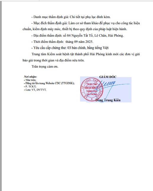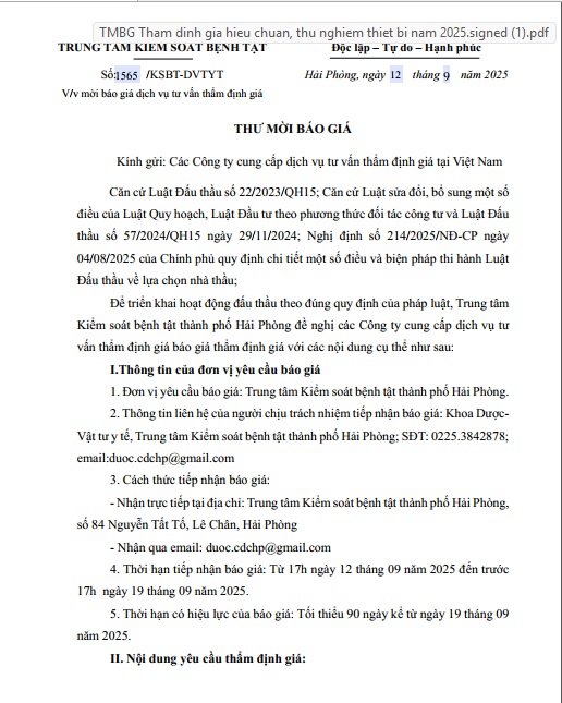 Trang chủThông tin mua sắmThư mời báo giá dịch vụ tư vấn thẩm định giá Thư mời báo giá dịch vụ tư vấn thẩm định giá 12 Tháng 9, 2025 Chia sẻ Facebook Email Print TMBG Tham dinh gia hieu chuan, thu nghiem thiet bi nam 2025.signed XEM THÊM Thu hồi lô cốm pha hỗn dịch uống Pyfaclor Kid do vi phạm mức độ 2 8 Tháng 10, 2025 1869 Thư mời báo giá khoa Sức khoẻ sinh sản 8 Tháng 10, 2025 1849 Thư mời báo giá 8 Tháng 10, 2025 TIN PHỔ BIẾN Thu hồi lô cốm pha hỗn dịch uống Pyfaclor Kid do vi phạm mức độ 2 8 Tháng 10, 2025 1869 Thư mời báo giá khoa Sức khoẻ sinh sản 8 Tháng 10, 2025 1849 Thư mời báo giá 8 Tháng 10, 2025 1848 Thư mời báo giá Hoá chất, vật tư xét nghiệm nước, thực phẩm, không khí 8 Tháng 10, 2025 Xem thêm