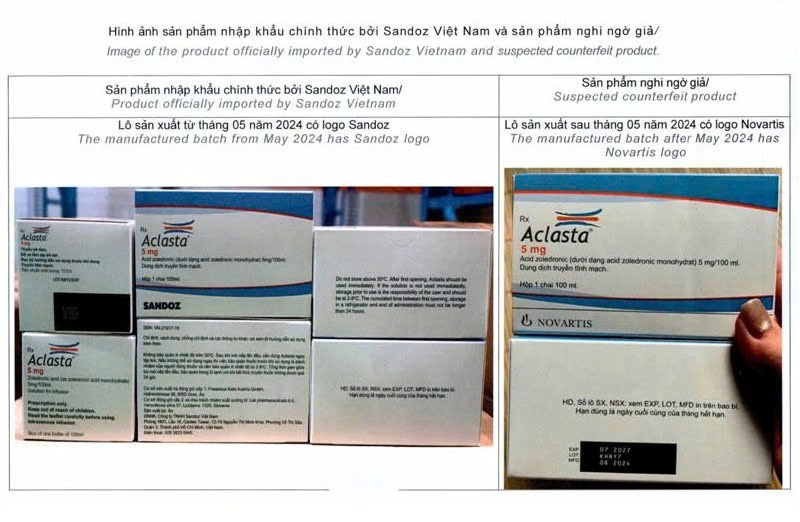 Theo báo cáo, thuốc Aclasta (mỗi 100ml chứa 5,33mg acid zoledronic monohydrate) do Công ty TNHH Sandoz Việt Nam đăng ký. Từ sau tháng 5/2024, sản phẩm chính hãng đã thay đổi bao bì, không còn in logo Novartis mà thay bằng logo Sandoz. Vì vậy, mọi sản phẩm Aclasta có ngày sản xuất sau tháng 5/2024 nhưng vẫn mang logo Novartis đều bị nghi ngờ là thuốc giả.