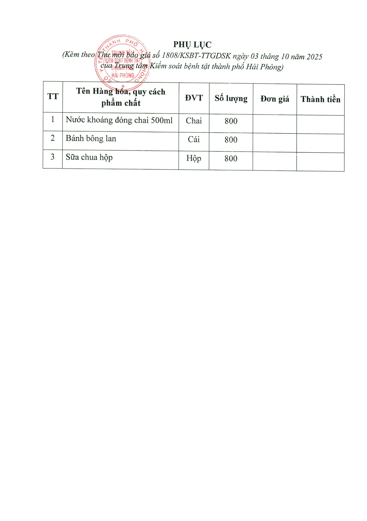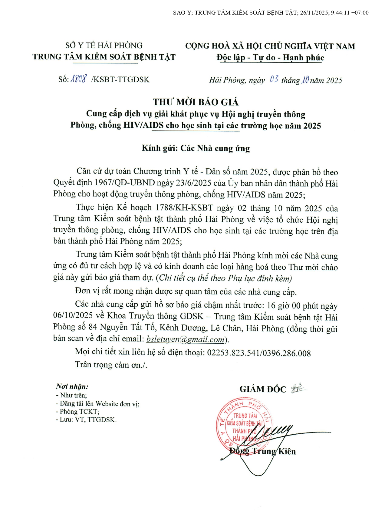 Trang chủThông tin mua sắmThư mời cung cấp dịch vụ giải khát phục vụ Hội nghị... Thư mời cung cấp dịch vụ giải khát phục vụ Hội nghị truyền thông phòng, chống HIV/AIDS cho học sinh tại các trường học năm 2025 3 Tháng 10, 2025 Chia sẻ Facebook Email Print XEM THÊM 107/KSBT-TCHC v/v chào giá in phiếu tiêm chủng 15 Tháng 1, 2026 92/KSBT-TCHC chào giá cung cấp dịch vụ mua VPP 2026 14 Tháng 1, 2026 79 TM-KSBT Thư mời báo giá dịch vụ kiểm nghiệm các thông số nước sạch 14 Tháng 1, 2026 TIN PHỔ BIẾN Sở Y tế khuyến cáo bảo vệ sức khỏe người dân trong thời điểm ô nhiễm không khí... 19 Tháng 1, 2026 19 Tháng 1, 2026 Thông điệp Phòng, chống bệnh sốt xuất huyết 16 Tháng 1, 2026 Ngành Y tế đóng góp tích cực vào phát triển kinh tế, xã hội thành phố. 16 Tháng 1, 2026 Xem thêm