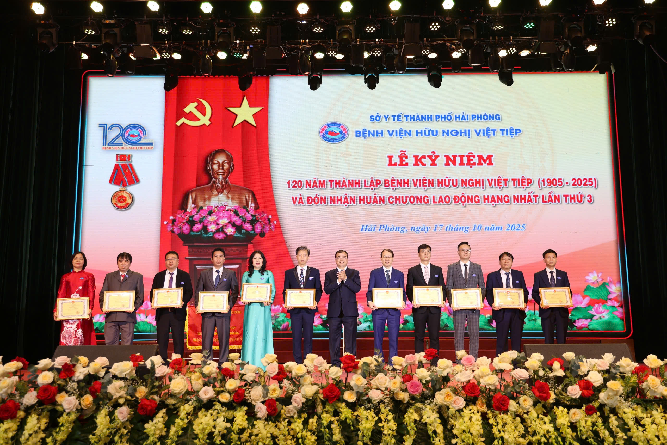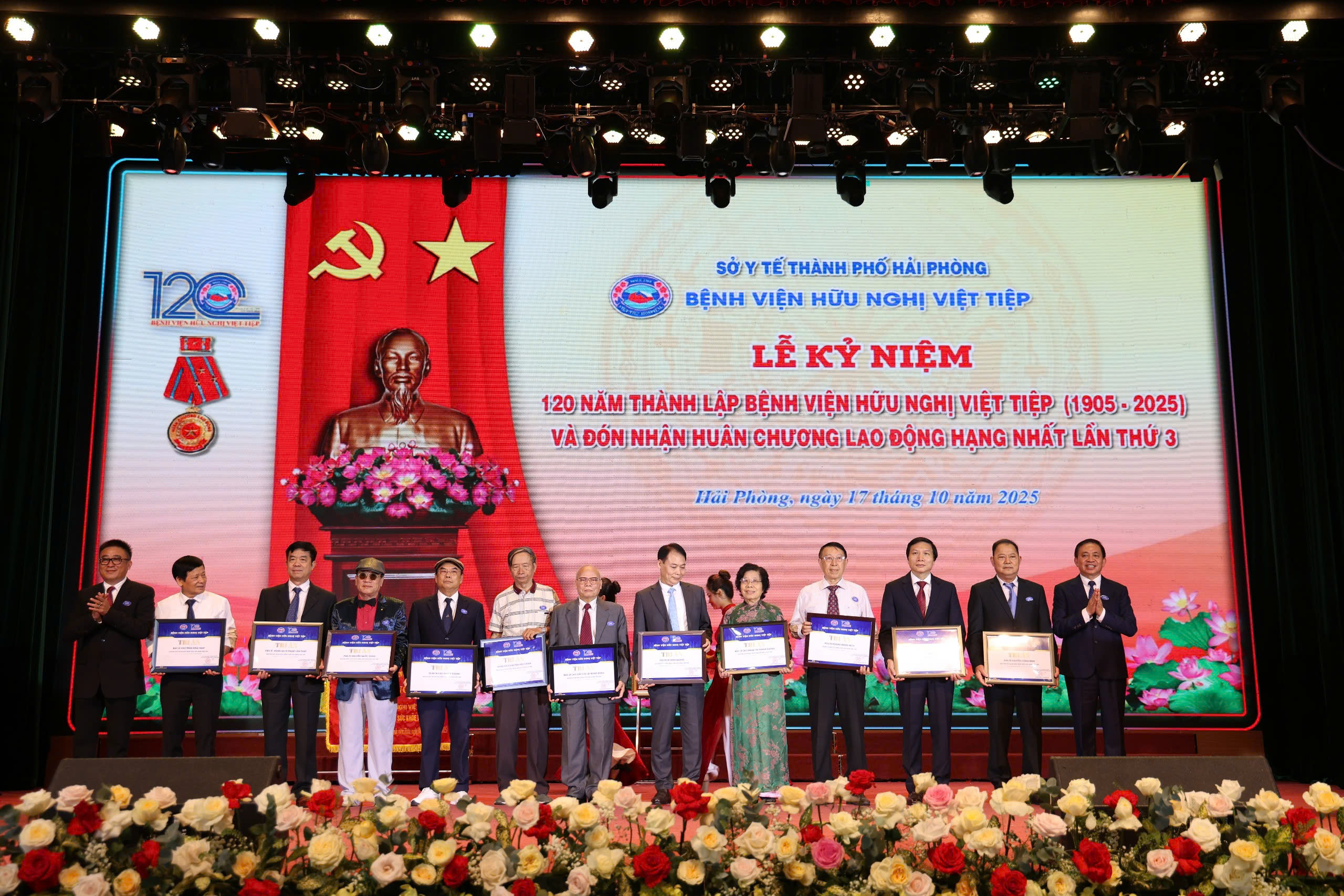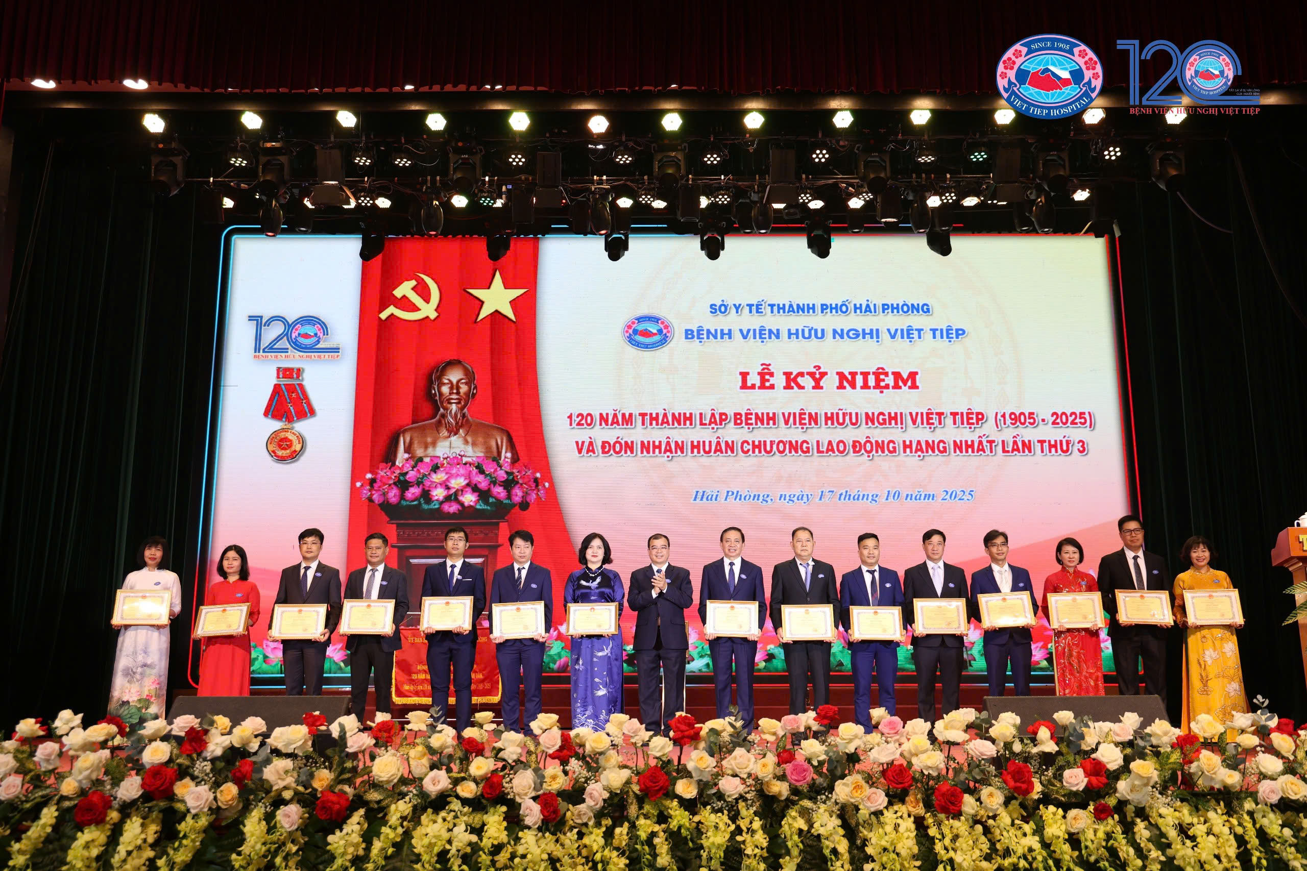 Sáng 17/10, trong không khí hân hoan, phấn khởi của những ngày thu lịch sử, tại Cung Văn hoá Lao động Hữu nghị Việt Tiệp (TP Hải Phòng), Bệnh viện Hữu Nghị Việt Tiệp long trọng tổ chức Lễ kỷ niệm 120 năm thành lập (1905 – 2025) và đón nhận Huân chương Lao động hạng Nhất lần thứ ba – phần thưởng cao quý của Đảng và Nhà nước, ghi nhận những đóng góp to lớn của các thế hệ cán bộ, viên chức, người lao động trong sự nghiệp chăm sóc, bảo vệ và nâng cao sức khỏe Nhân dân.