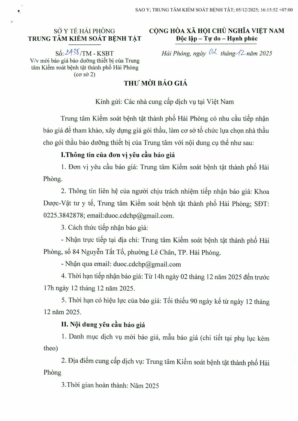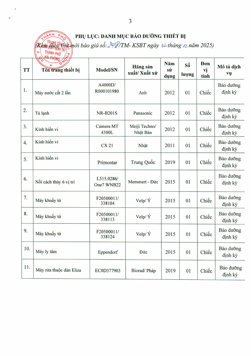 Trang chủThông tin mua sắm2438 Thư mời báo giá bảo dưỡng trang thiết bị 2438 Thư mời báo giá bảo dưỡng trang thiết bị 2 Tháng 12, 2025 Chia sẻ Facebook Email Print XEM THÊM Sở Y tế khuyến cáo bảo vệ sức khỏe người dân trong thời điểm ô nhiễm không khí ở mức cao 19 Tháng 1, 2026 19 Tháng 1, 2026 Thông điệp Phòng, chống bệnh sốt xuất huyết 16 Tháng 1, 2026 TIN PHỔ BIẾN Sở Y tế khuyến cáo bảo vệ sức khỏe người dân trong thời điểm ô nhiễm không khí... 19 Tháng 1, 2026 19 Tháng 1, 2026 Thông điệp Phòng, chống bệnh sốt xuất huyết 16 Tháng 1, 2026 Ngành Y tế đóng góp tích cực vào phát triển kinh tế, xã hội thành phố. 16 Tháng 1, 2026 Xem thêm