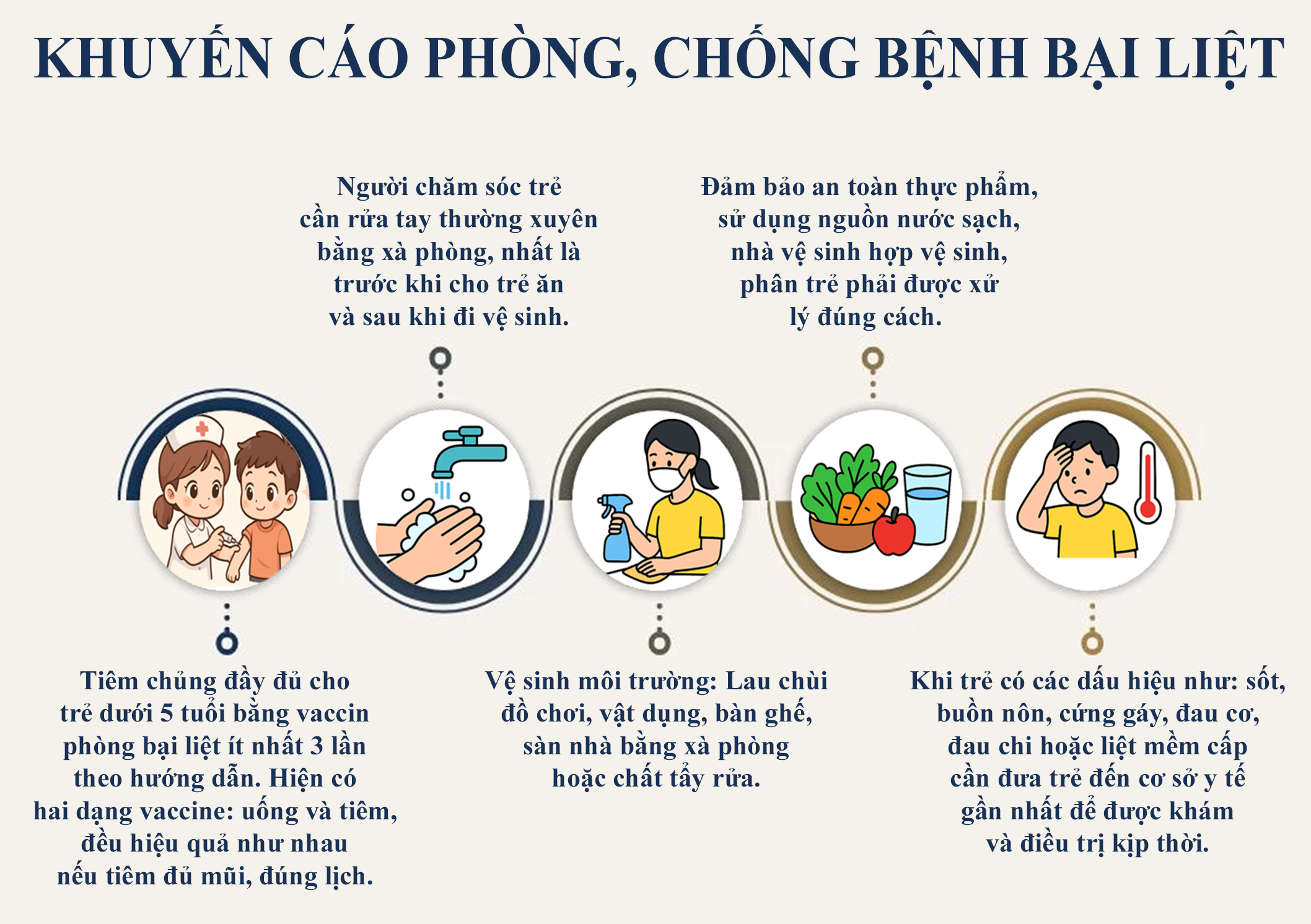Để chủ động phòng, chống và bảo vệ vững chắc thành quả thanh toán bệnh bại liệt, ngành Y tế khuyến cáo mỗi gia đình cần đưa trẻ đi tiêm chủng đầy đủ, đúng lịch các mũi vắc xin bại liệt theo chương trình tiêm chủng mở rộng; chủ động tiêm bù cho những trẻ chưa tiêm hoặc tiêm chưa đủ. Người dân cần thực hiện tốt vệ sinh cá nhân, thường xuyên rửa tay bằng xà phòng, sử dụng nước sạch, bảo đảm an toàn thực phẩm và vệ sinh môi trường sống. Khi phát hiện trẻ có biểu hiện yếu liệt bất thường, cần đưa ngay đến cơ sở y tế để được khám, chẩn đoán và xử trí kịp thời; phối hợp chặt chẽ với ngành y tế trong công tác giám sát và phòng, chống bệnh bại liệt, góp phần bảo vệ sức khỏe cộng đồng.