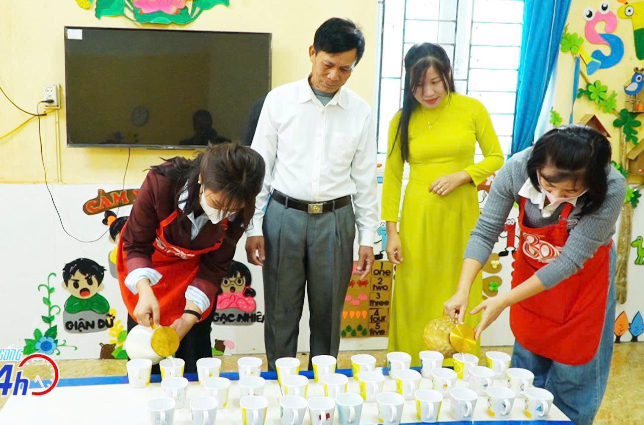 Ông Đinh Thanh Thơ, Trưởng Ban đại diện cha mẹ học sinh và giáo viên Trường Mầm non Tiên Động giám sát việc cho trẻ uống sữa bột trong các bữa phụ