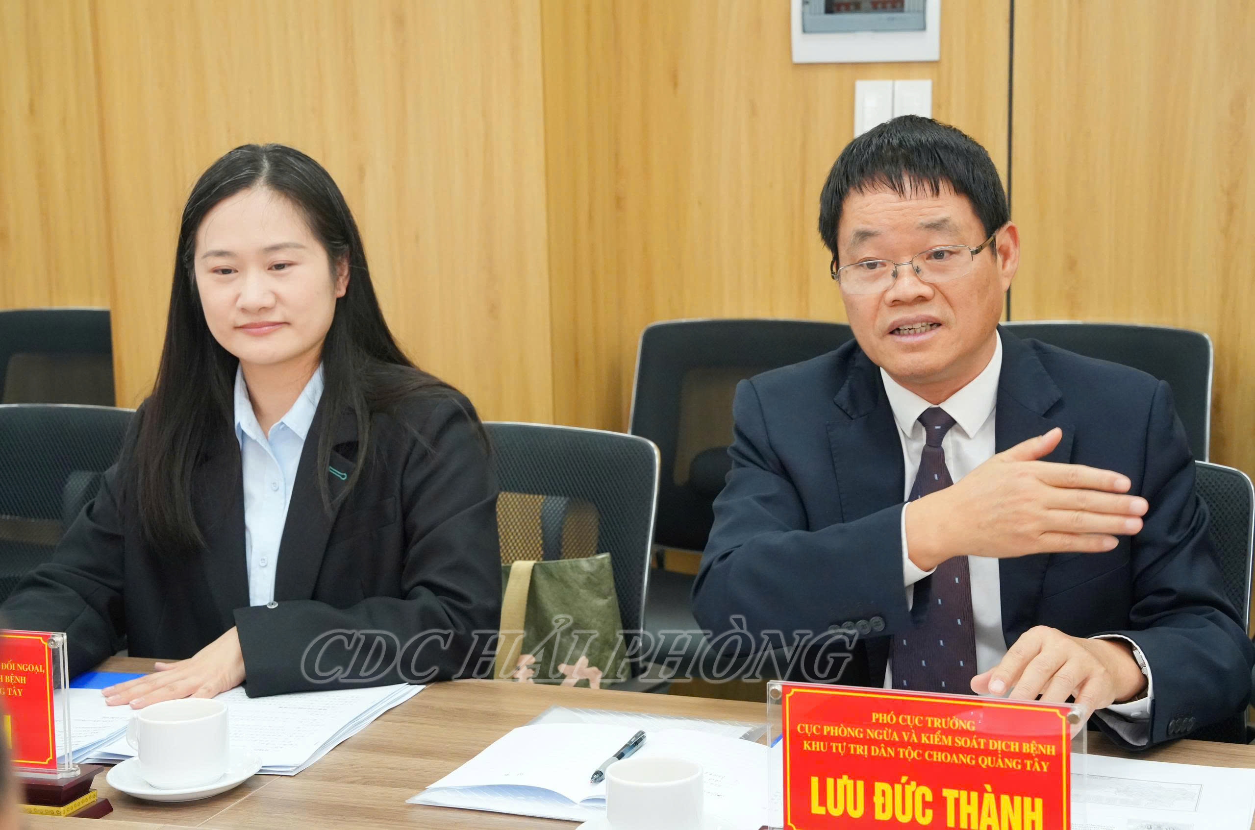 Ông Lưu Đức Thành, Phó Cục trưởng Cục Phòng ngừa và Kiểm soát Dịch bệnh Khu tự trị Dân tộc Choang Quảng Tây đánh giá cao về cách tiếp cận, cơ chế mở và mục tiêu hợp tác về lĩnh vực y tế Hải Phòng. Năm 2025, năm đầu tiên đánh dấu mốc Quảng Tây và TP Hải Phòng phối hợp về lĩnh vực y tế, trước đó Việt Nam đã có các tỉnh vùng biên giới giáp tỉnh Quảng Tây, Trung Quốc phối hợp về lĩnh vực y tế như: Quảng Ninh, Cao Bằng, Tuyên Quang, Lạng Sơn…Hải Phòng có cơ chế mở, mục tiêu hợp tác rõ sẽ tạo tiền đề cho 02 địa phương có nhiều cơ hội thực hiện triển khai hoạt động lĩnh vực y tế. Đối với lĩnh vực phòng ngừa bệnh tật ông Thành nhất trí cáo với nội dung đề xuất của CDC Hải Phòng về giao lưu hợp tác. Thời gian tới trước khi lãnh đạo thành phố Hải Phòng và lãnh đạo tỉnh Quảng Tây có cuộc làm việc đại diện y tế 02 bên sẽ có những trao đổi sâu hơn, phương thức triển khai…Khi có văn bản ký kết giữa Hải Phòng và Quảng Tây sẽ triển khai toàn diện và mang lại hiệu quả bền vững.