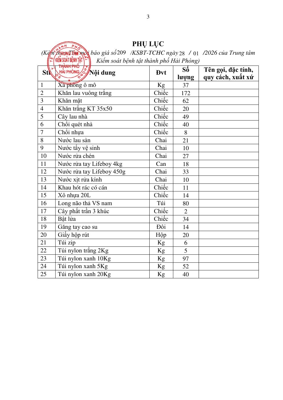 Trang chủThông tin mua sắm209/KSBT-TCHC V/v chào giá cung cấp dịch vụ mua vật tư tiêu... 209/KSBT-TCHC V/v chào giá cung cấp dịch vụ mua vật tư tiêu hao năm 2026 28 Tháng 1, 2026 Chia sẻ Facebook Email Print XEM THÊM 249/KSBT-DVTYT v/v mua sắm thuôvs Generic cho khoa SKSS-CDC Hải Phòng 2026 2 Tháng 2, 2026 Khuyến cáo: Phòng, chống ảnh hưởng của ô nhiễm không khí đến sức khỏe cộng đồng 31 Tháng 1, 2026 Tăng cường hợp tác khoa học và công nghệ, nâng cao năng lực y tế dự phòng 31 Tháng 1, 2026 TIN PHỔ BIẾN 249/KSBT-DVTYT v/v mua sắm thuôvs Generic cho khoa SKSS-CDC Hải Phòng 2026 2 Tháng 2, 2026 Khuyến cáo: Phòng, chống ảnh hưởng của ô nhiễm không khí đến sức khỏe cộng đồng 31 Tháng 1, 2026 Tăng cường hợp tác khoa học và công nghệ, nâng cao năng lực y tế dự phòng 31 Tháng 1, 2026 CDC Hải Phòng phát huy dân chủ, nâng cao chất lượng hoạt động 31 Tháng 1, 2026 Xem thêm