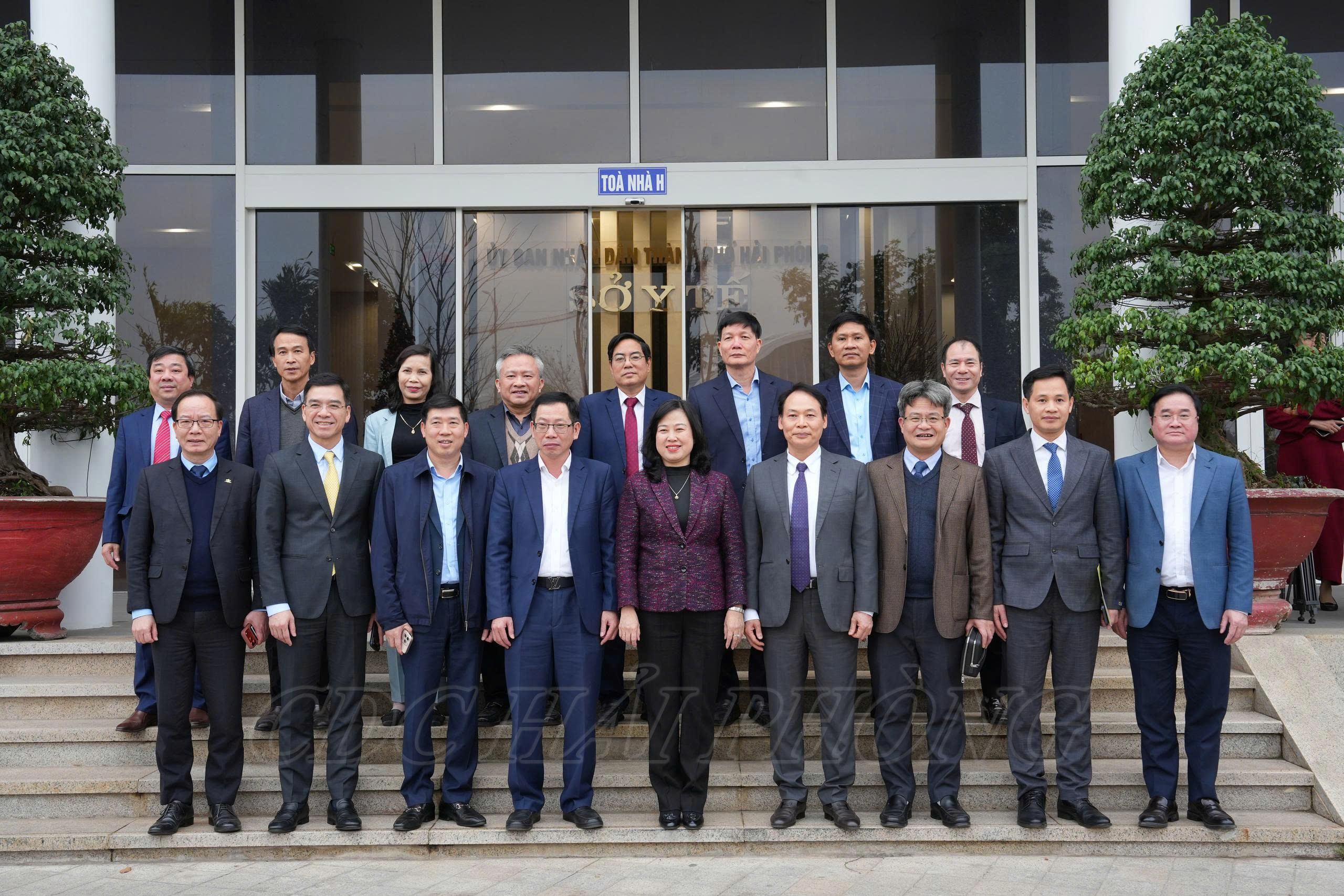 Bộ trưởng Bộ Y tế Đào Hồng Lan, Phó Chủ tịch UBND thành phố Hải Phòng Vũ Tiến Phụng cùng thành viên đoàn công tác và Ban giám đốc Sở Y tế thành phố Hải Phòng