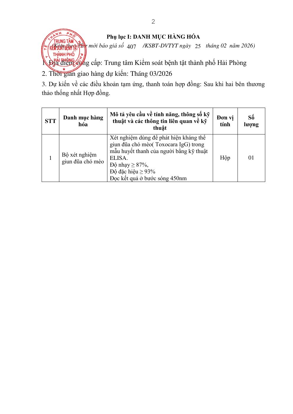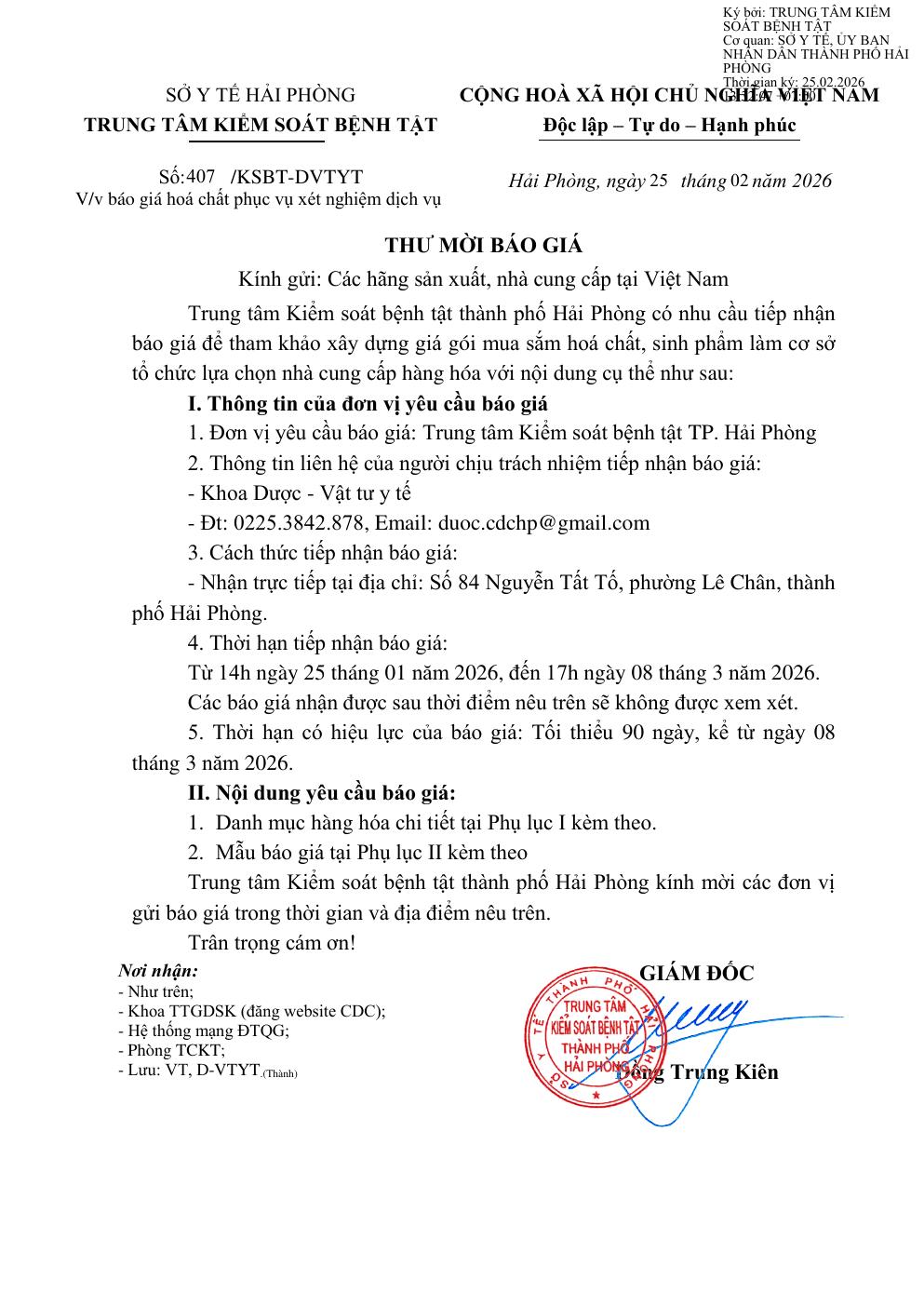 Trang chủThông tin mua sắm407/KSBT-DVTYT v/v báo giá hoá chất phục vụ xét nghiệm dịch vụ 407/KSBT-DVTYT v/v báo giá hoá chất phục vụ xét nghiệm dịch vụ 25 Tháng 2, 2026 Chia sẻ Facebook Email Print XEM THÊM TIỂU SỬ TÓM TẮT CỦA NGƯỜI ỨNG CỬ ĐẠI BIỂU HĐND THÀNH PHỐ HẢI PHÒNG KHOÁ XVII, NHIỆM KỲ 2026-2031. 25 Tháng 2, 2026 Đảm đảm công tác khám, chữa bệnh, phòng bệnh trong dịp Tết 25 Tháng 2, 2026 Phó Bí thư Thường trực Thành ủy thăm, chúc mừng Trung tâm Kiểm soát bệnh tật thành phố nhân dịp kỷ niệm... 25 Tháng 2, 2026 TIN PHỔ BIẾN TIỂU SỬ TÓM TẮT CỦA NGƯỜI ỨNG CỬ ĐẠI BIỂU HĐND THÀNH PHỐ HẢI PHÒNG KHOÁ XVII, NHIỆM... 25 Tháng 2, 2026 Đảm đảm công tác khám, chữa bệnh, phòng bệnh trong dịp Tết 25 Tháng 2, 2026 Phó Bí thư Thường trực Thành ủy thăm, chúc mừng Trung tâm Kiểm soát bệnh tật thành phố... 25 Tháng 2, 2026 Tăng cường phòng chống bệnh truyền nhiễm mùa lễ hội 25 Tháng 2, 2026 Xem thêm
