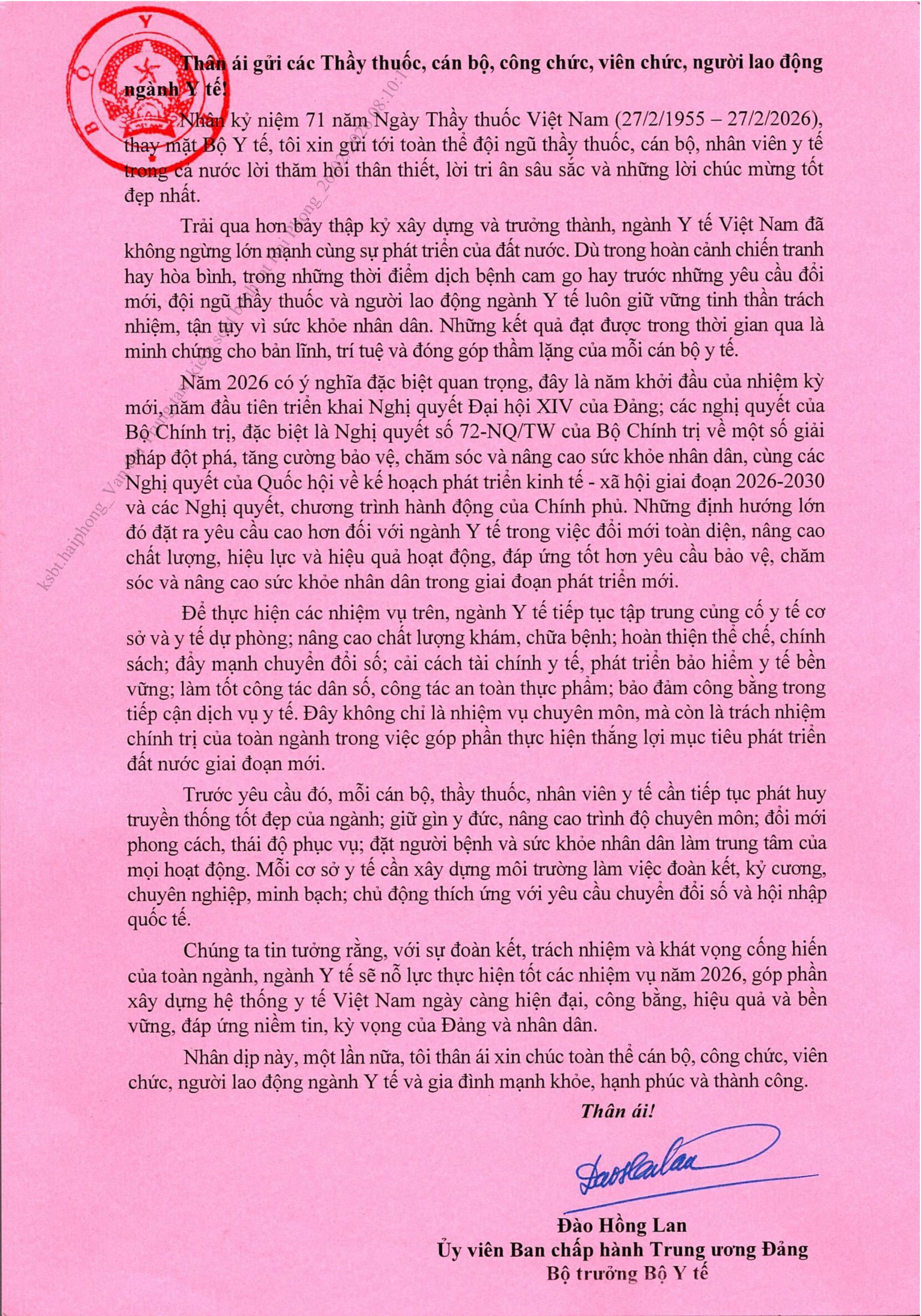 Trang chủTin nổi bậtBộ trưởng BYT chúc mừng Thầy thuốc, cán bộ, công chức, viên... Bộ trưởng BYT chúc mừng Thầy thuốc, cán bộ, công chức, viên chức, người lao động ngành Y tế 26 Tháng 2, 2026 Chia sẻ Facebook Email Print XEM THÊM 421/TM-KSBT Thư mời báo giá dịch vụ kiểm nghiệm thông số nước sạch 26 Tháng 2, 2026 Sở Y tế Hải Phòng tổ chức kỷ niệm 71 năm Ngày Thầy thuốc Việt Nam 26 Tháng 2, 2026 TIỂU SỬ TÓM TẮT CỦA NGƯỜI ỨNG CỬ ĐẠI BIỂU HĐND THÀNH PHỐ HẢI PHÒNG KHOÁ XVII, NHIỆM KỲ 2026-2031. 25 Tháng 2, 2026 TIN PHỔ BIẾN 421/TM-KSBT Thư mời báo giá dịch vụ kiểm nghiệm thông số nước sạch 26 Tháng 2, 2026 Sở Y tế Hải Phòng tổ chức kỷ niệm 71 năm Ngày Thầy thuốc Việt Nam 26 Tháng 2, 2026 Bộ trưởng BYT chúc mừng Thầy thuốc, cán bộ, công chức, viên chức, người lao động ngành Y... 26 Tháng 2, 2026 TIỂU SỬ TÓM TẮT CỦA NGƯỜI ỨNG CỬ ĐẠI BIỂU HĐND THÀNH PHỐ HẢI PHÒNG KHOÁ XVII, NHIỆM... 25 Tháng 2, 2026 Xem thêm