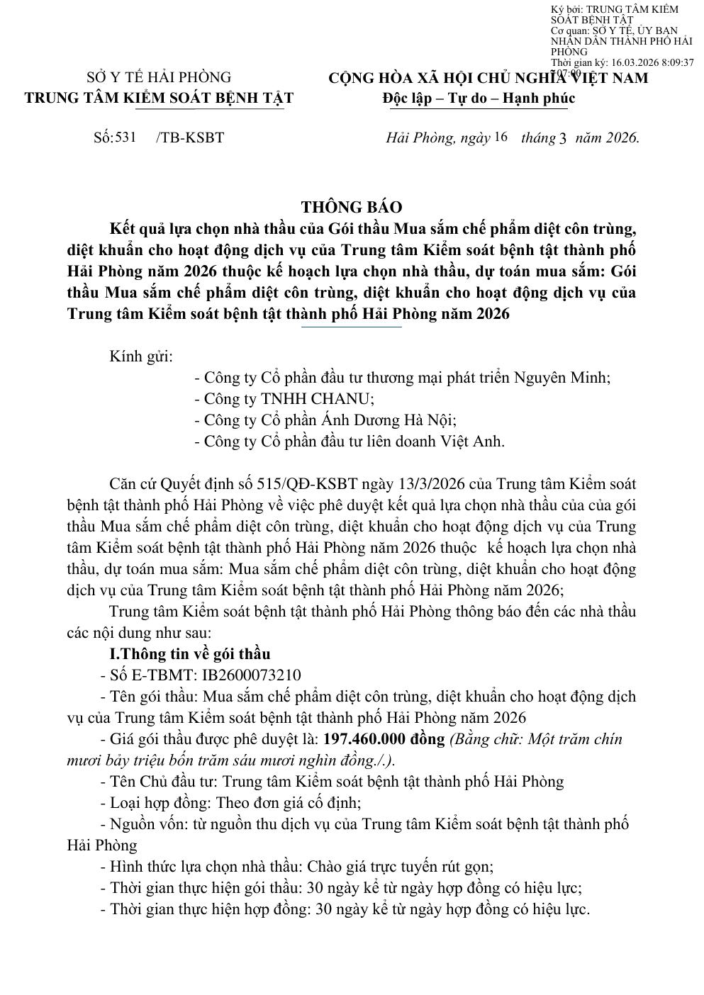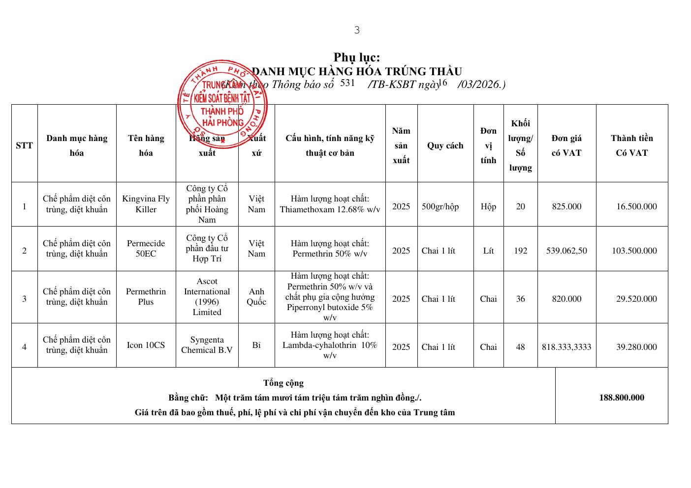 Trang chủThông tin mua sắm531 Thông báo kết quả lựa chọn nhà thầu Gói thầu Mua... 531 Thông báo kết quả lựa chọn nhà thầu Gói thầu Mua sắm chế phẩm diệt côn trùng, diệt khuẩn 16 Tháng 3, 2026 Chia sẻ Facebook Email Print XEM THÊM 537 Thư mời báo giá háo chất xét nghiệm dịch vụ 16 Tháng 3, 2026 535 Thư mời báo giá sửa chữa Bộ chưng cất đạm, nồi hấp 16 Tháng 3, 2026 536 Thư mời báo giá mua sắm vật tư, hoá chất, sinh phẩm 16 Tháng 3, 2026 TIN PHỔ BIẾN 537 Thư mời báo giá háo chất xét nghiệm dịch vụ 16 Tháng 3, 2026 535 Thư mời báo giá sửa chữa Bộ chưng cất đạm, nồi hấp 16 Tháng 3, 2026 536 Thư mời báo giá mua sắm vật tư, hoá chất, sinh phẩm 16 Tháng 3, 2026 531 Thông báo kết quả lựa chọn nhà thầu Gói thầu Mua sắm chế phẩm diệt côn trùng,... 16 Tháng 3, 2026 Xem thêm