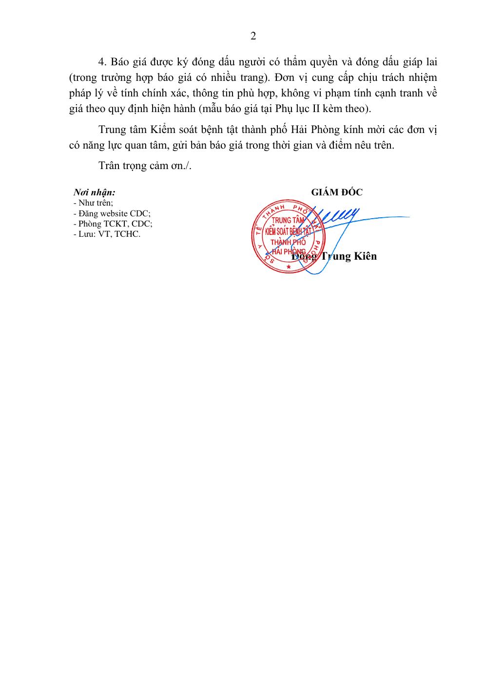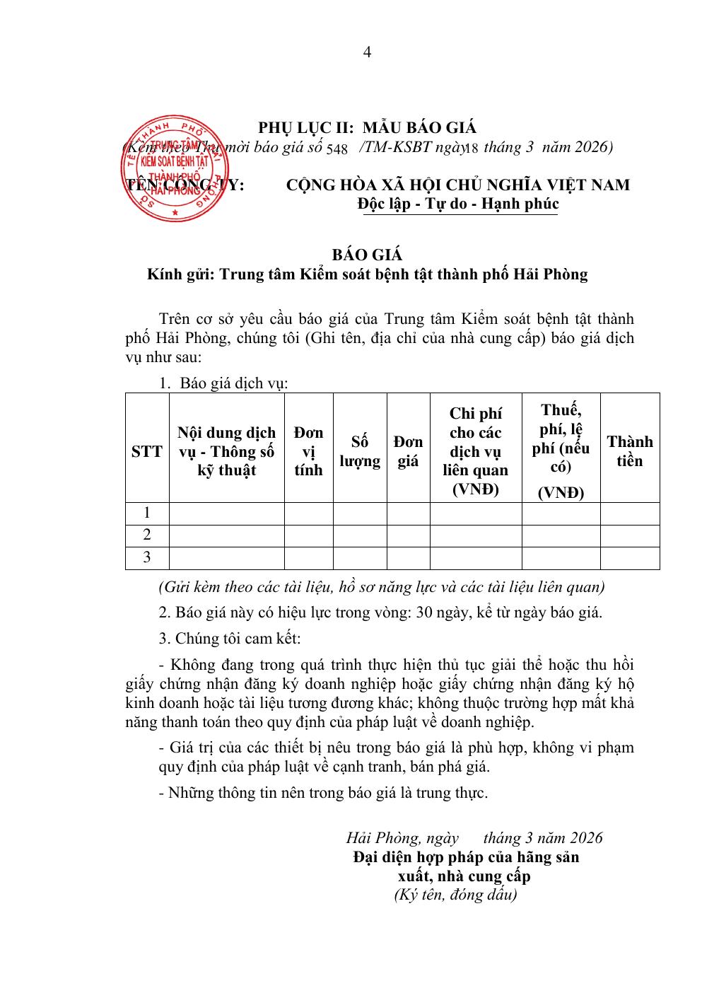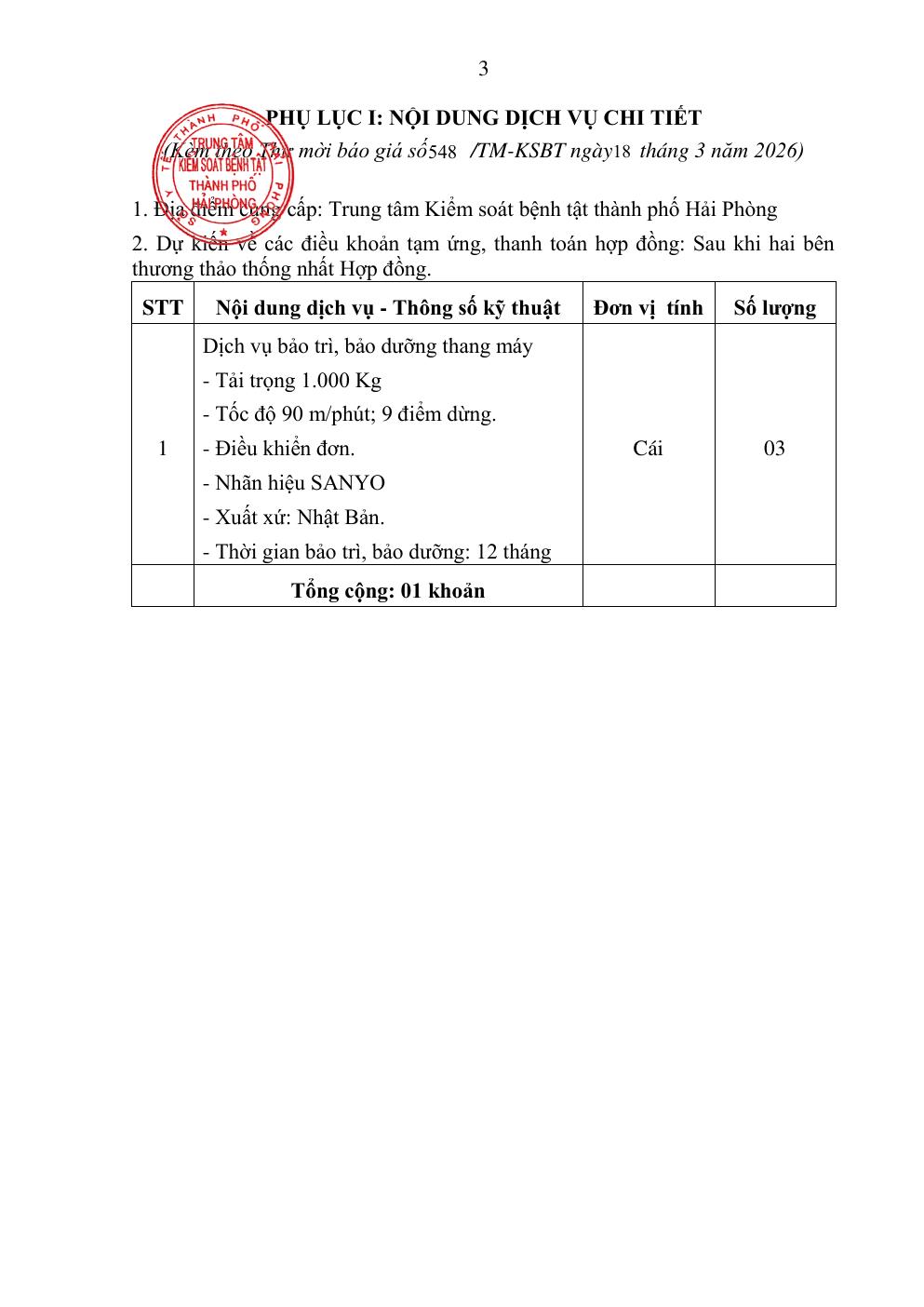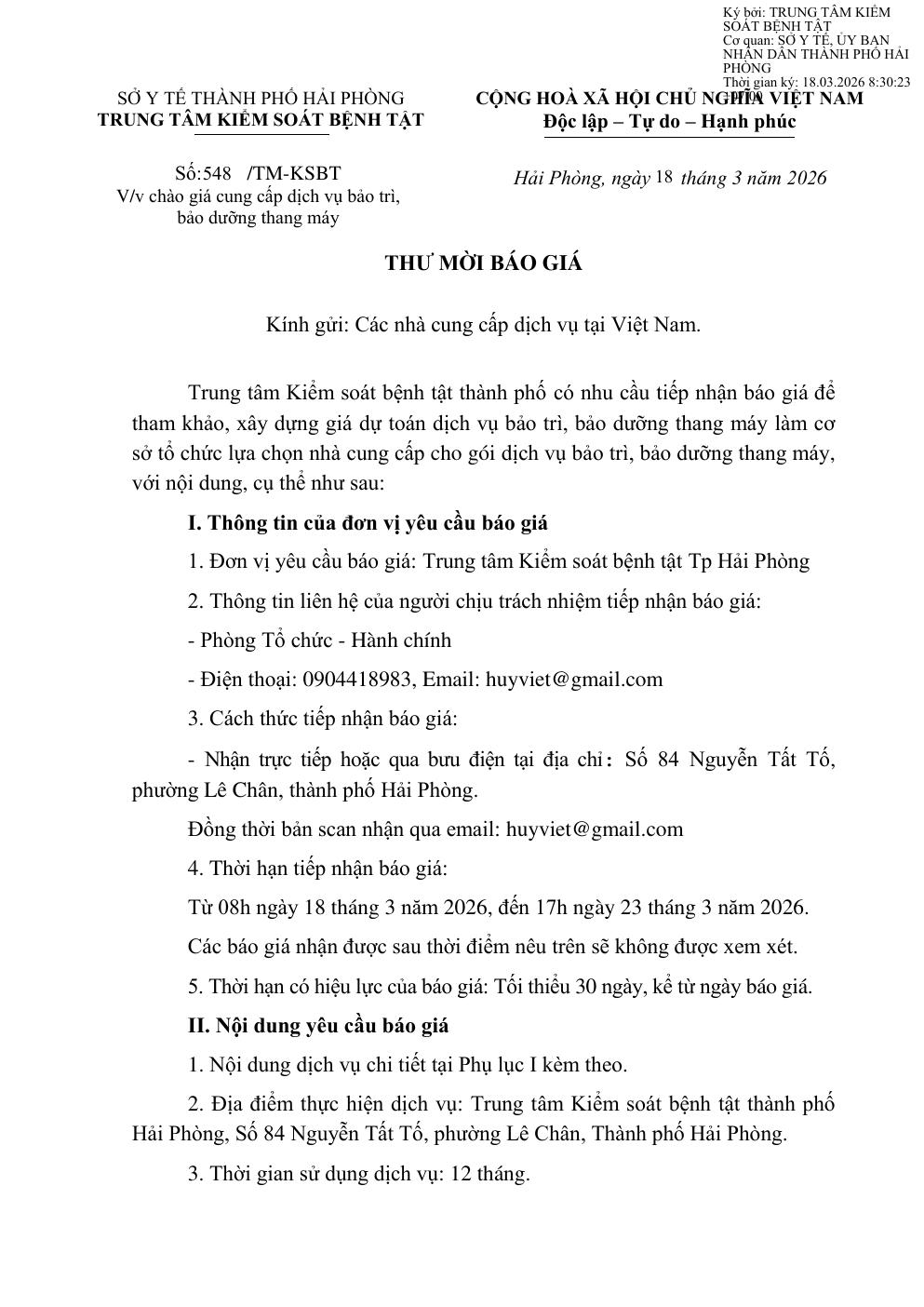 Trang chủThông tin mua sắm548 Thư mời báo giá cung cấp dịch vụ bảo trì, bảo... 548 Thư mời báo giá cung cấp dịch vụ bảo trì, bảo dưỡng thang máy 18 Tháng 3, 2026 Chia sẻ Facebook Email Print XEM THÊM Hải Phòng tiếp tục mở rộng ứng dụng năng lượng nguyên tử trong các ngành, lĩnh vực, đặc biệt là y... 18 Tháng 3, 2026 “Phát hiện lao gắn với khám sức khỏe định kỳ cho mỗi người dân” 18 Tháng 3, 2026 Hải Phòng chủ động “chặn đứng” sốt xuất huyết Dengue ngay từ sớm 18 Tháng 3, 2026 TIN PHỔ BIẾN Hải Phòng tiếp tục mở rộng ứng dụng năng lượng nguyên tử trong các ngành, lĩnh vực,... 18 Tháng 3, 2026 “Phát hiện lao gắn với khám sức khỏe định kỳ cho mỗi người dân” 18 Tháng 3, 2026 548 Thư mời báo giá cung cấp dịch vụ bảo trì, bảo dưỡng thang máy 18 Tháng 3, 2026 Hải Phòng chủ động “chặn đứng” sốt xuất huyết Dengue ngay từ sớm 18 Tháng 3, 2026 Xem thêm