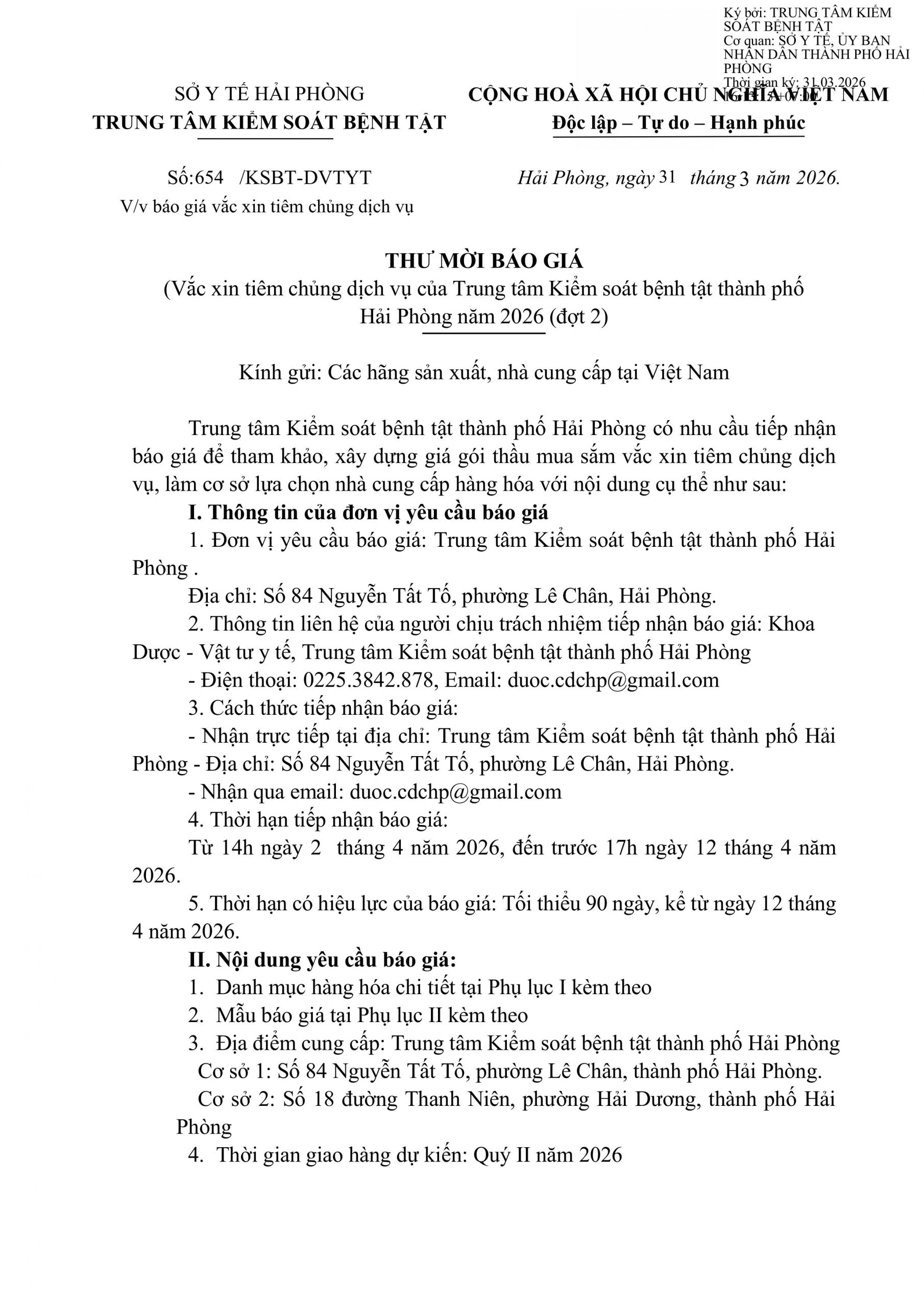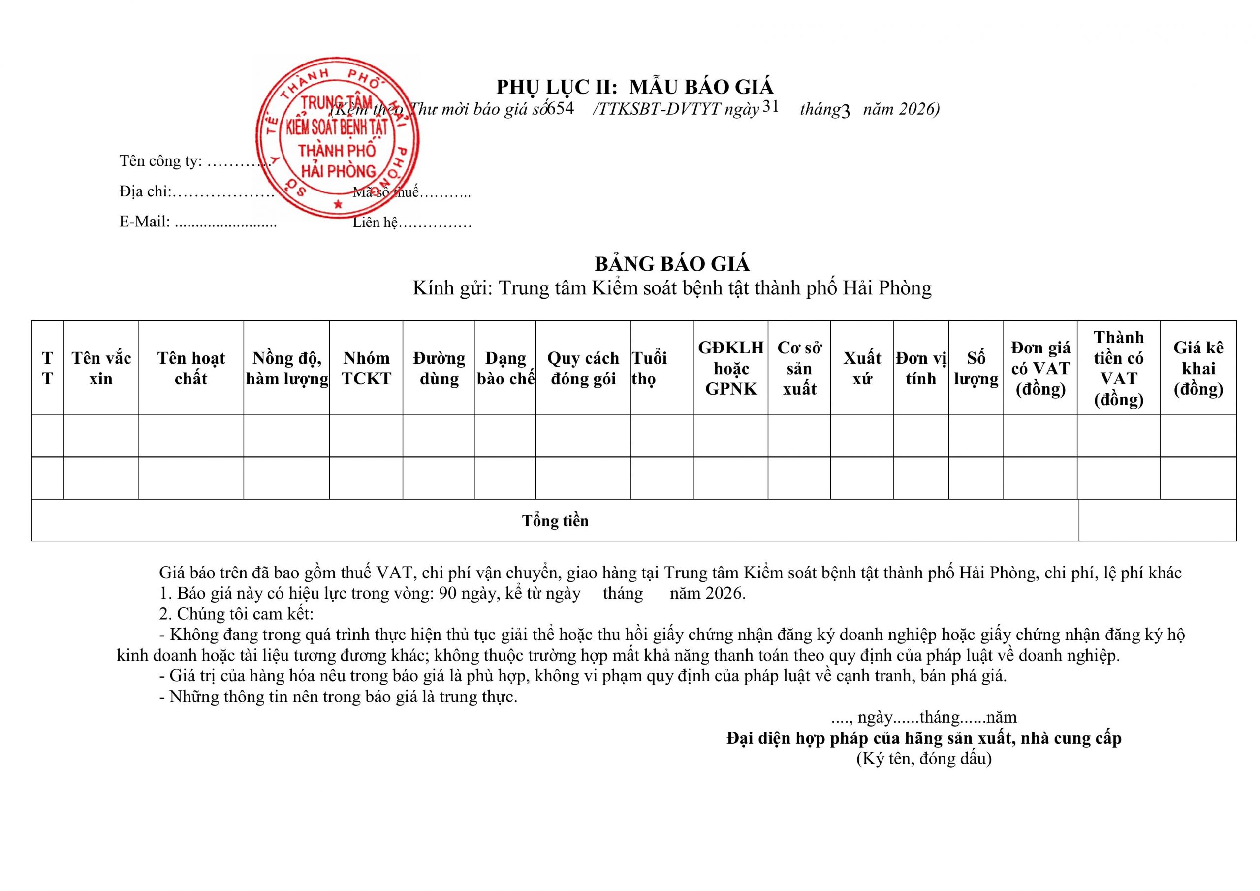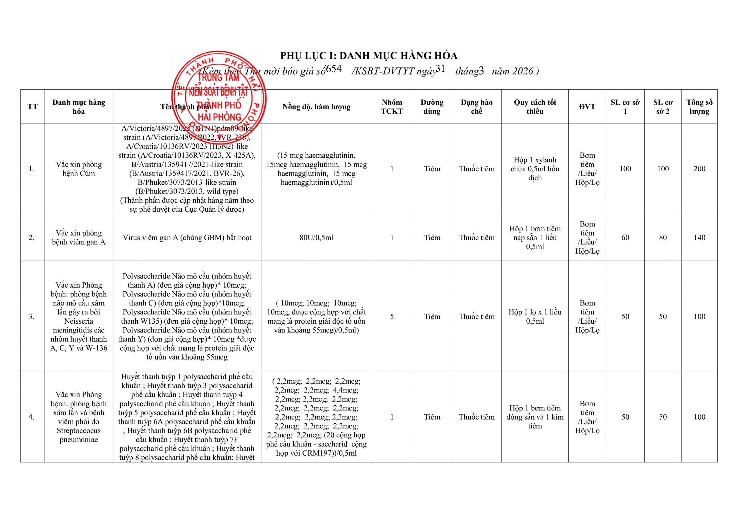Trang chủThông tin mua sắm654 Thư mời báo gia Vắc xin tiêm chủng dịch vụ 654 Thư mời báo gia Vắc xin tiêm chủng dịch vụ 31 Tháng 3, 2026 Chia sẻ Facebook Email Print XEM THÊM Đồng hành bảo vệ sức khỏe người lao động 2 Tháng 4, 2026 Nâng cao nhận thức về chứng tự kỷ 2 Tháng 4, 2026 Bộ Y tế cảnh báo về an toàn thực phẩm tại các bếp ăn tập thể, bếp ăn trường học 2 Tháng 4, 2026 TIN PHỔ BIẾN Đồng hành bảo vệ sức khỏe người lao động 2 Tháng 4, 2026 Nâng cao nhận thức về chứng tự kỷ 2 Tháng 4, 2026 Bộ Y tế cảnh báo về an toàn thực phẩm tại các bếp ăn tập thể, bếp ăn... 2 Tháng 4, 2026 Nhiều hoạt động hưởng ứng ngày Sức khỏe toàn dân. 2 Tháng 4, 2026 Xem thêm