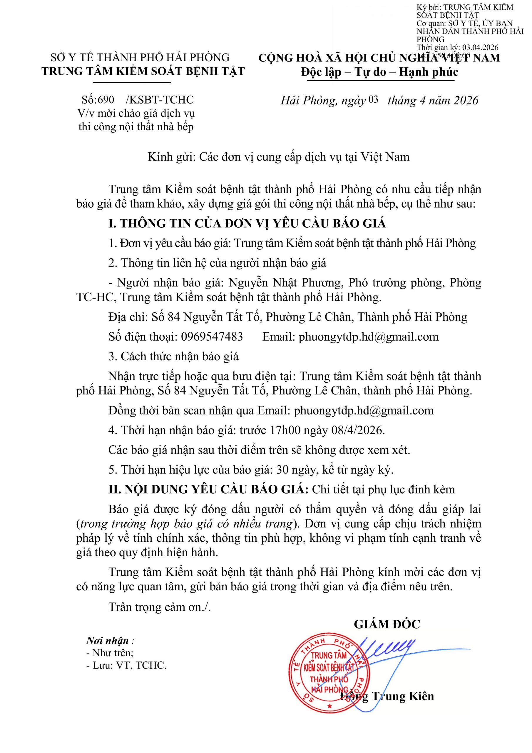 Trang chủThông tin mua sắm690 Thư mời báo giá dịch vụ thi ông nội thất nhà... 690 Thư mời báo giá dịch vụ thi ông nội thất nhà bếp 3 Tháng 4, 2026 Chia sẻ Facebook Email Print XEM THÊM Đồng hành bảo vệ sức khỏe người lao động 2 Tháng 4, 2026 Nâng cao nhận thức về chứng tự kỷ 2 Tháng 4, 2026 Bộ Y tế cảnh báo về an toàn thực phẩm tại các bếp ăn tập thể, bếp ăn trường học 2 Tháng 4, 2026 TIN PHỔ BIẾN 690 Thư mời báo giá dịch vụ thi ông nội thất nhà bếp 3 Tháng 4, 2026 Đồng hành bảo vệ sức khỏe người lao động 2 Tháng 4, 2026 Nâng cao nhận thức về chứng tự kỷ 2 Tháng 4, 2026 Bộ Y tế cảnh báo về an toàn thực phẩm tại các bếp ăn tập thể, bếp ăn... 2 Tháng 4, 2026 Xem thêm