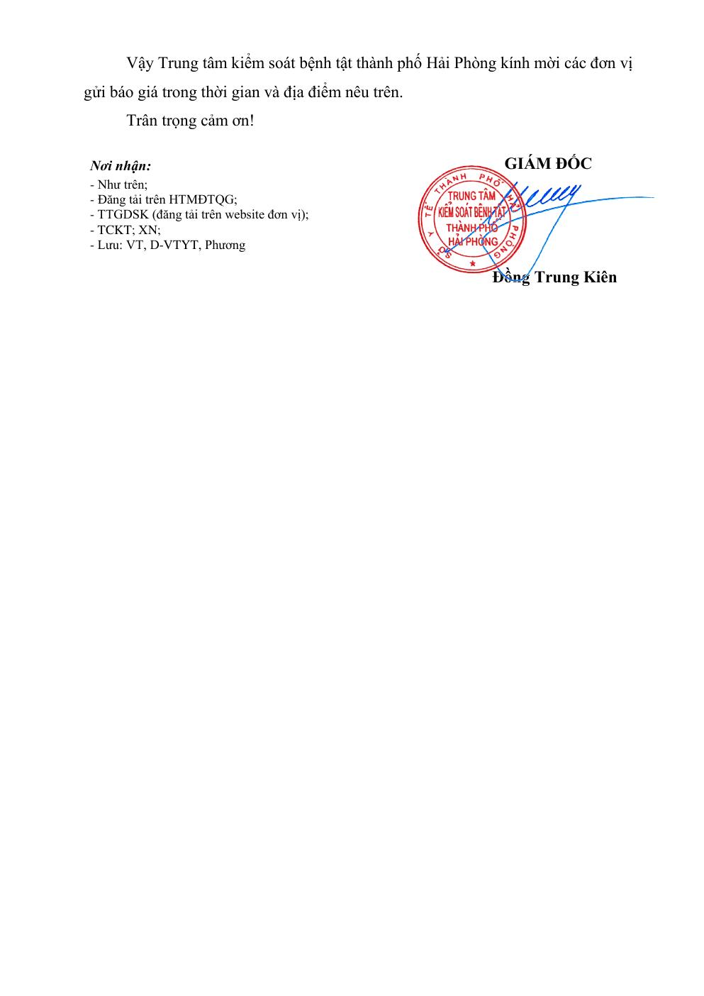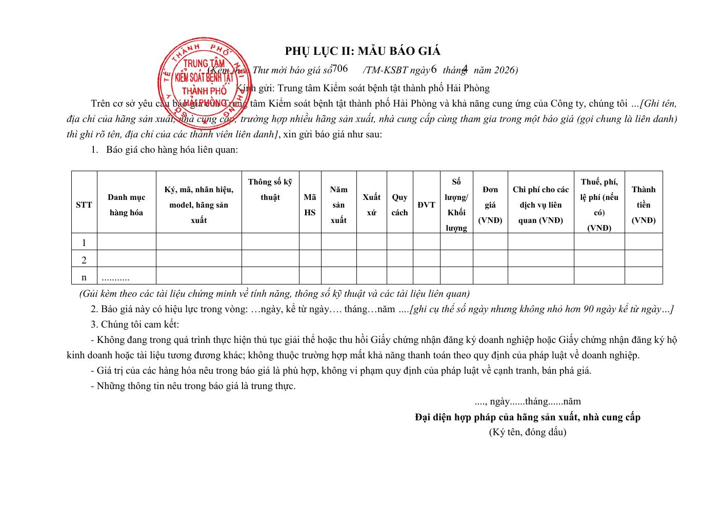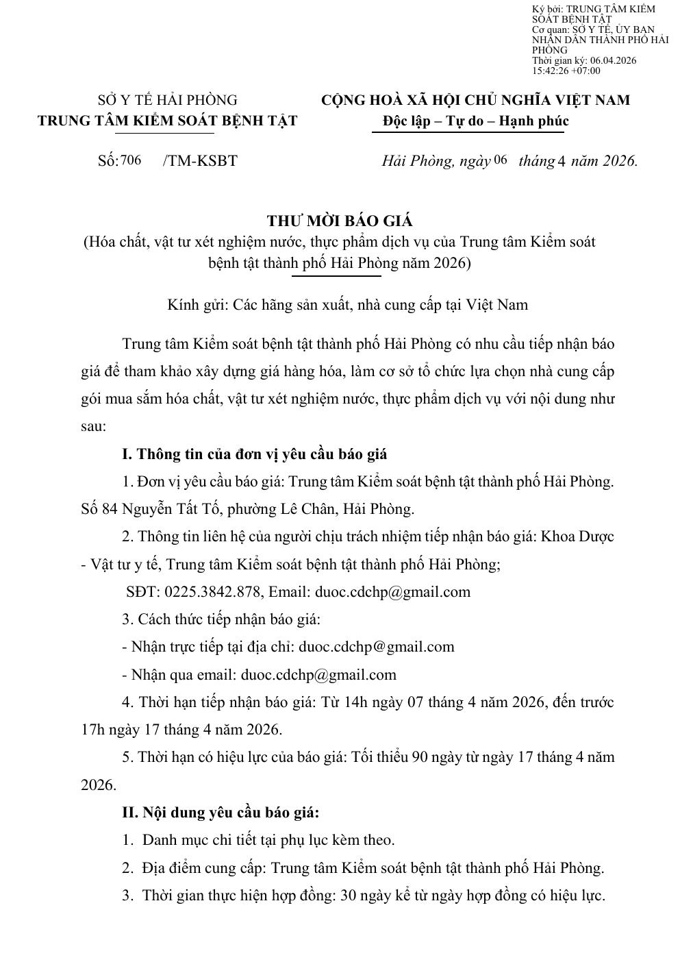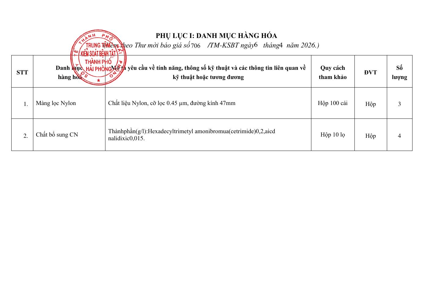 Trang chủThông tin mua sắm706 Thư mời báo giá hoá chất, vật tư xét nghiệm nước,... 706 Thư mời báo giá hoá chất, vật tư xét nghiệm nước, thực phẩm dịch vụ 6 Tháng 4, 2026 Chia sẻ Facebook Email Print XEM THÊM Hải Phòng phát động Ngày Sức khỏe toàn dân và phong trào hiến máu tình nguyện năm 2026 7 Tháng 4, 2026 709 Thư mời báo giá mua sắm trang thiết bị 7 Tháng 4, 2026 Đôi nam CDC Hải Phòng đoạt giải nhì giải Pickleball Bộ Y tế- VTV8 6 Tháng 4, 2026 TIN PHỔ BIẾN Hải Phòng phát động Ngày Sức khỏe toàn dân và phong trào hiến máu tình nguyện năm 2026 7 Tháng 4, 2026 709 Thư mời báo giá mua sắm trang thiết bị 7 Tháng 4, 2026 Đôi nam CDC Hải Phòng đoạt giải nhì giải Pickleball Bộ Y tế- VTV8 6 Tháng 4, 2026 706 Thư mời báo giá hoá chất, vật tư xét nghiệm nước, thực phẩm dịch vụ 6 Tháng 4, 2026 Xem thêm